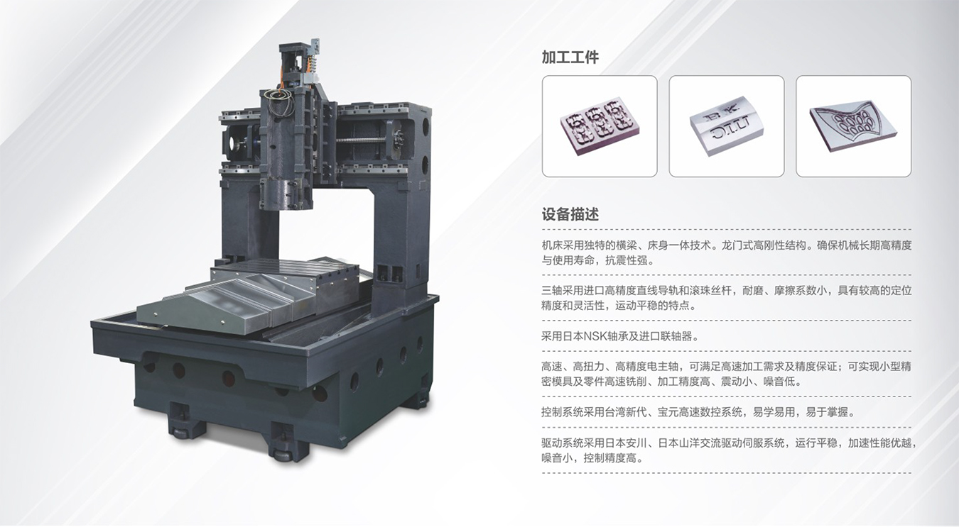 新型環(huán)保數(shù)控CNC -高速雕銑機(jī)采用高速24000-48000轉(zhuǎn)電主軸,選配靜電式油霧凈化器,三軸采用線性導(dǎo)軌,速度快,精度高,是模具、電極、批量零件加工;采用臺(tái)灣新代或臺(tái)灣寶元控制系統(tǒng),日本YASKWA電機(jī)及驅(qū)動(dòng),臺(tái)灣上銀、銀泰導(dǎo)軌及滾珠絲桿,華雕精密主軸,是高轉(zhuǎn)速、高移動(dòng)速度的結(jié)合。